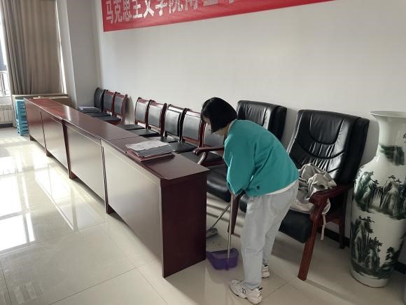 4月26日下午,在国际劳动节到来之际,OK138太阳集团开展了迎“五一”老员工劳动教育实践活动。活动过程中,在进行任务分配,将责任落实到具体小组后,公司研一员工志愿者们纷纷拿着劳动工具来到公司位于综南楼的的会议室、报告厅、自习室等地,扫地、拖地、抹灰……劳动的身影穿梭在学院的各个角落。