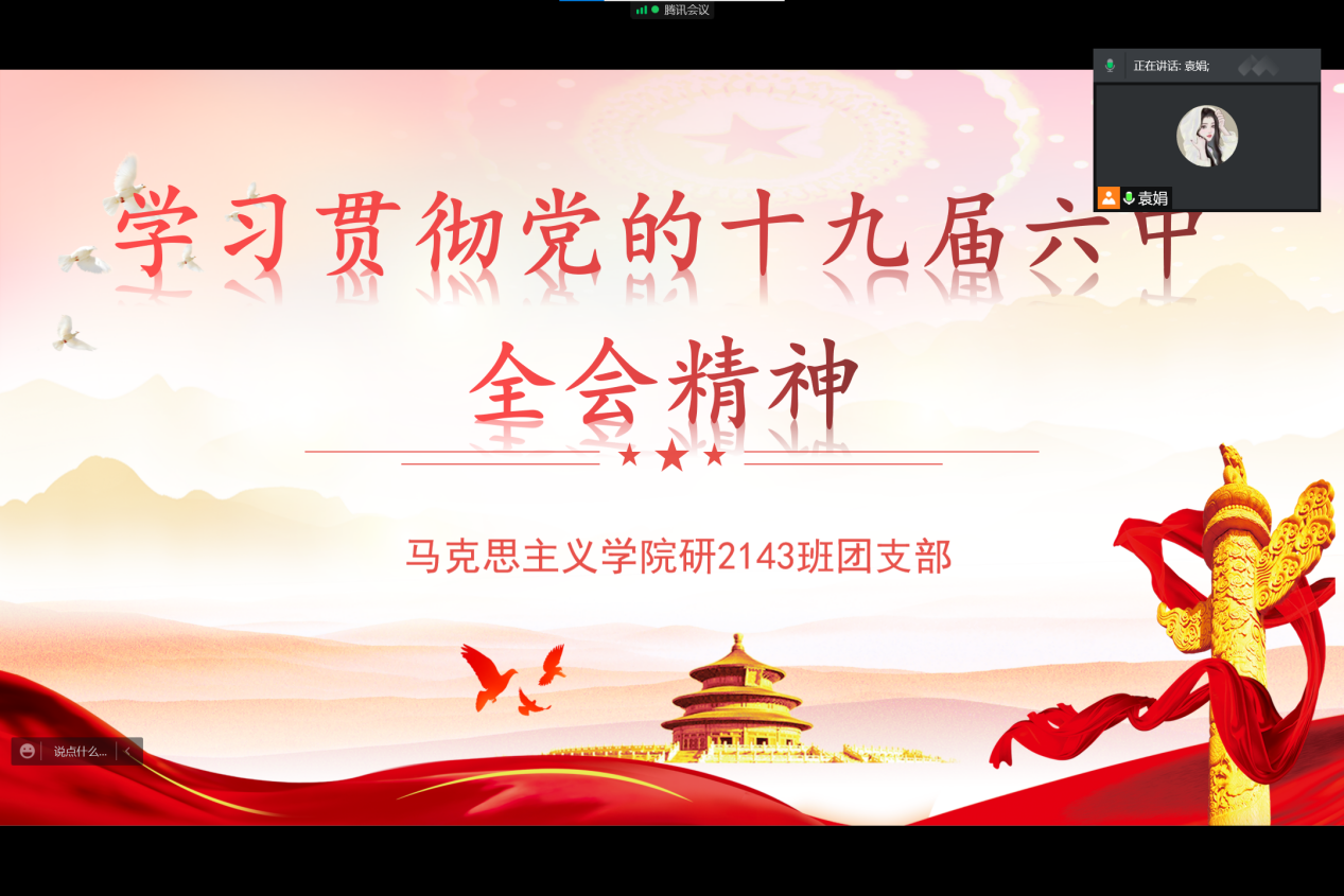 最后,团支书袁娟进行总结,她强调,党的十九届六中全会不仅是对过去的总结,更是对未来的展望。身为马院学子,身为新时代青年,更要意识到肩上担起的时代重担,要奋发向上,勤奋努力,让精神照亮前行的方向,为实现中华民族伟大复兴的中国梦不懈奋斗。