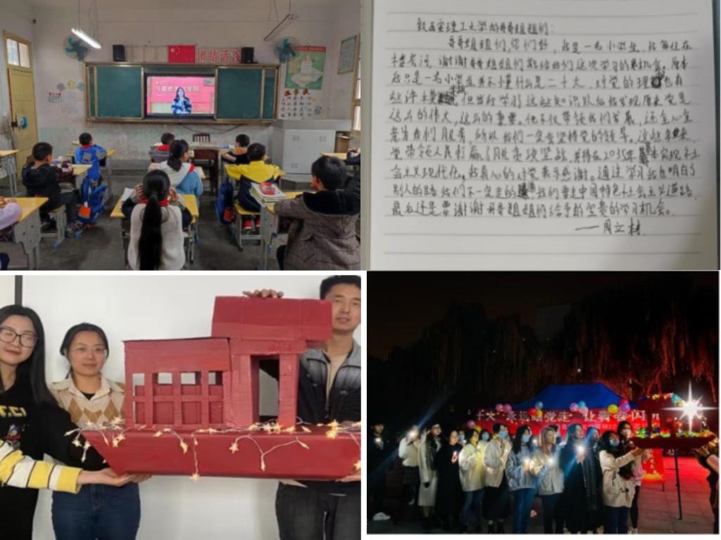 支部成员结合自己的学习所得,主动联络山区小学,线上为我省旬阳市石门镇楼房河村小学师生宣讲党的二十大精神,讲述红色故事,并在宣讲结束后收到多份小朋友们分享的学习感悟。支部成员手工制作红船模型并在公司曲江校区进行展示,面向全校员工讲述红船的重要象征意义、红船精神的文化内涵以及中国共产党的成长历史,讲述革命年代鲜活感人的英雄故事,引导公司员工参与党史知识竞答活动,书写青春宣言,一起重温中国共产党从无到有、从弱小到强大的发展历程。