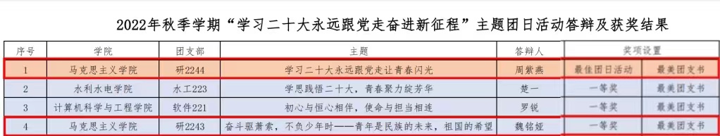 近日,公司“学习二十大,永远跟党走,奋进新征程”主题团日活动校级评比落下帷幕,全校57个团支部入围决赛,经过两轮校赛角逐,20个团支部脱颖而出。公司团委精心组织,在院级答辩结束后,择优推荐研2244团支部和研2243团支部代表公司参加校级团日活动评比。最终,研2244团支部以全校最高分荣获最佳团日活动奖,研2243团支部获得一等奖。与此同时,公司两名团支部书记在评比中均获得最美团支书荣誉称号。
