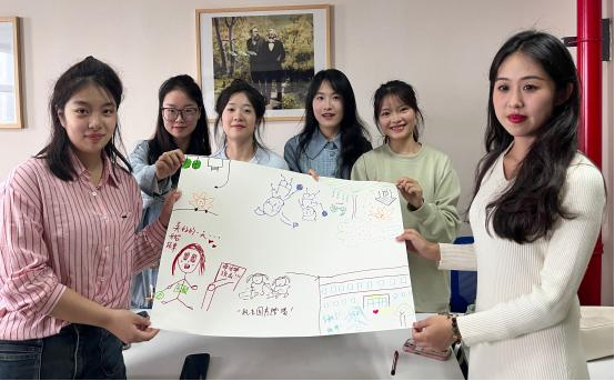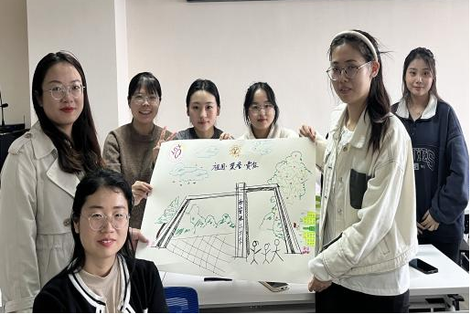 最后,各组以“我爱我的校园”为主题自由创作。员工以小组为单位在白纸上绘画自己心中的学校,不同颜色的彩笔也象征着每位同学所留意到的学校独特的风景与特点,而这些不同的风景和特点最终都汇聚成一幅完整而又感人的画作。各小组派出主创人员为大家讲述画作中所呈现的内容与其中的故事,员工的讲述展现了同学们对于新家庭、新环境的认可与接纳。本环节引导团体成员主动适应、接纳、肯定新的环境,增进了大家对校园的感情。