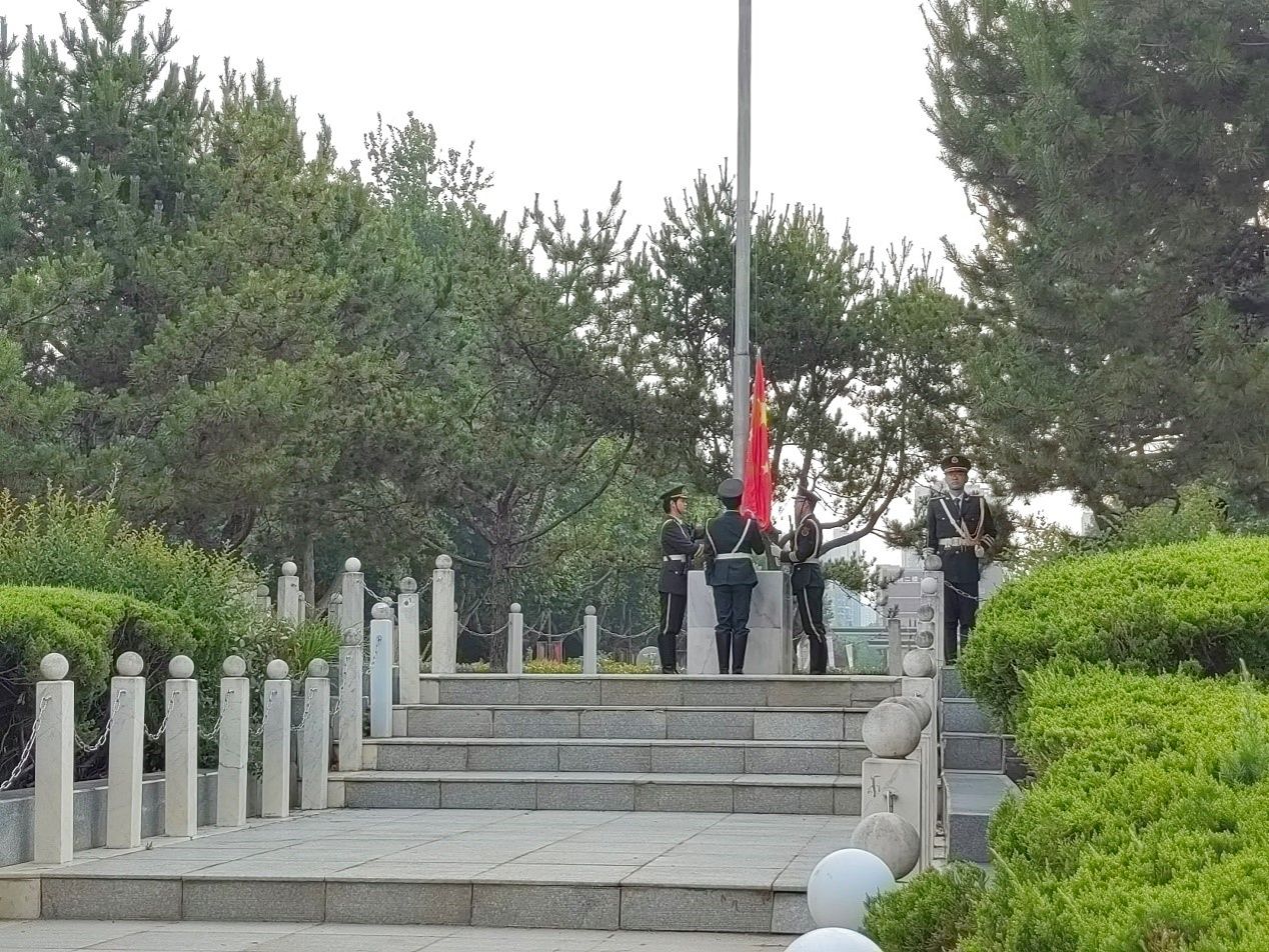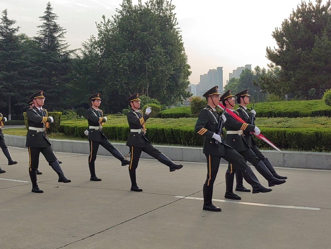 升旗仪式于清晨7点正式开始。国旗护卫队迈着整齐划一而铿锵有力的步伐,护送鲜艳的五星红旗走向升旗台。