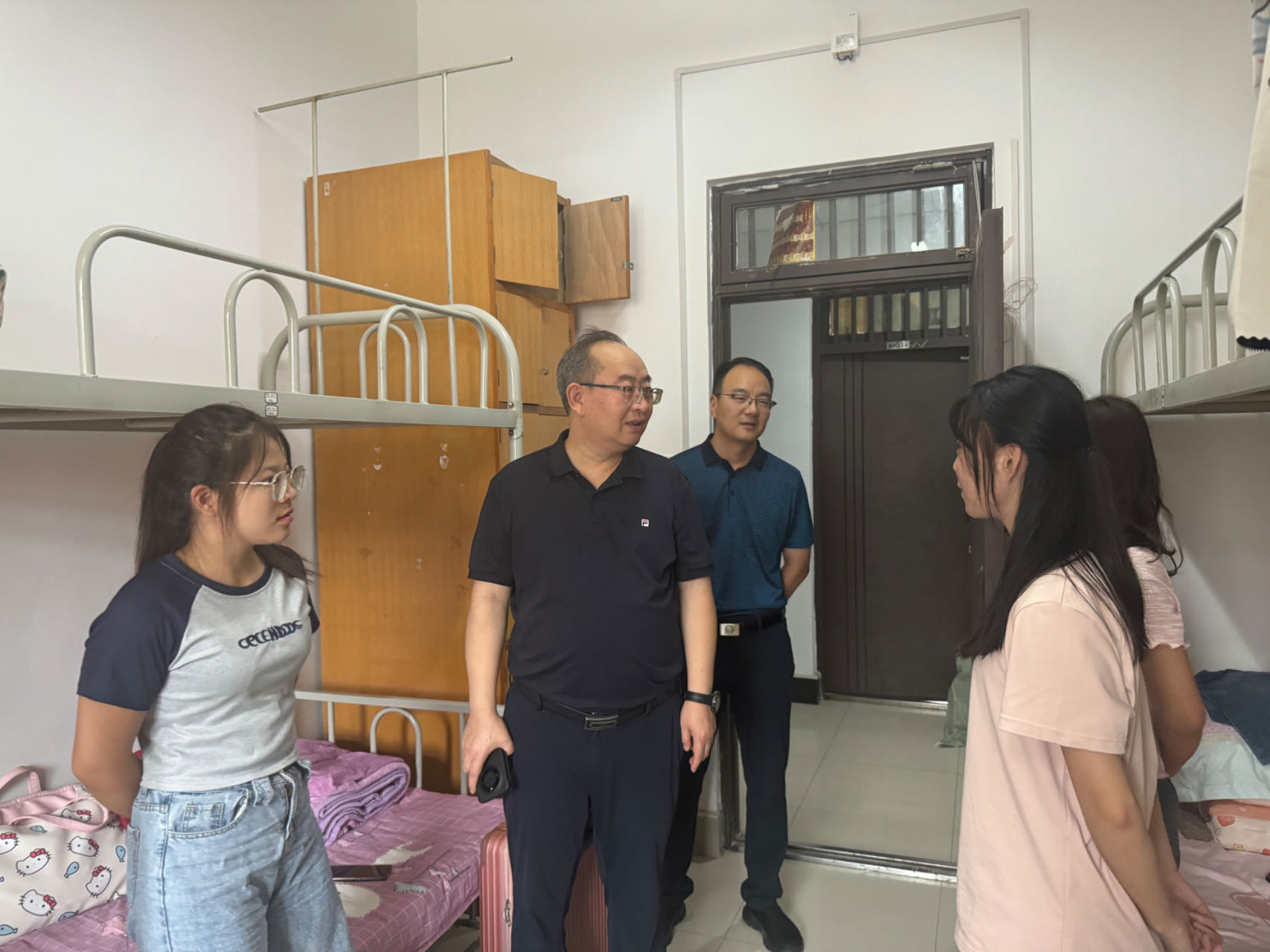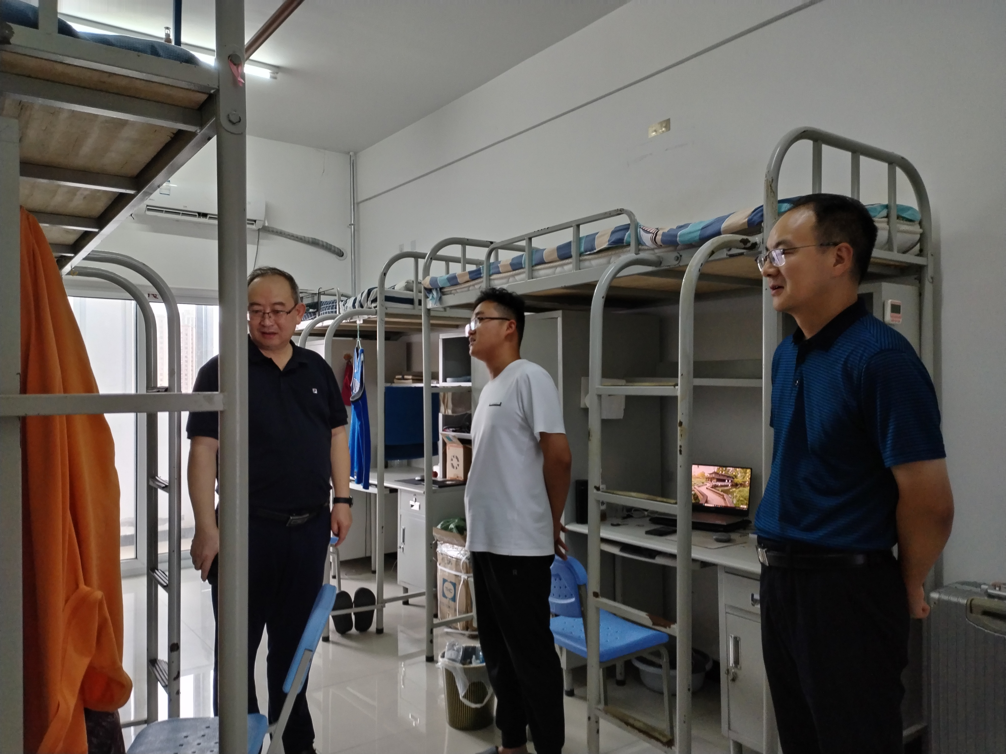 8月25日下午,公司党委书记张锐、经理梁严冰、辅导员王莹等前往员工宿舍对新生进行看望和慰问。走访中,学院领导与同学们进行了亲切的交流,听取同学们对宿舍、空调、洗浴等生活条件的意见建议,了解大家思想、心理、家庭困难等方面情况,并就大家所关心的问题给予悉心指导,叮嘱同学们克服困难、珍惜时间,遵守校规校纪,乐学乐为,善作善成,努力养成积极进取的学习风气、共同营造健康活泼的校园氛围。