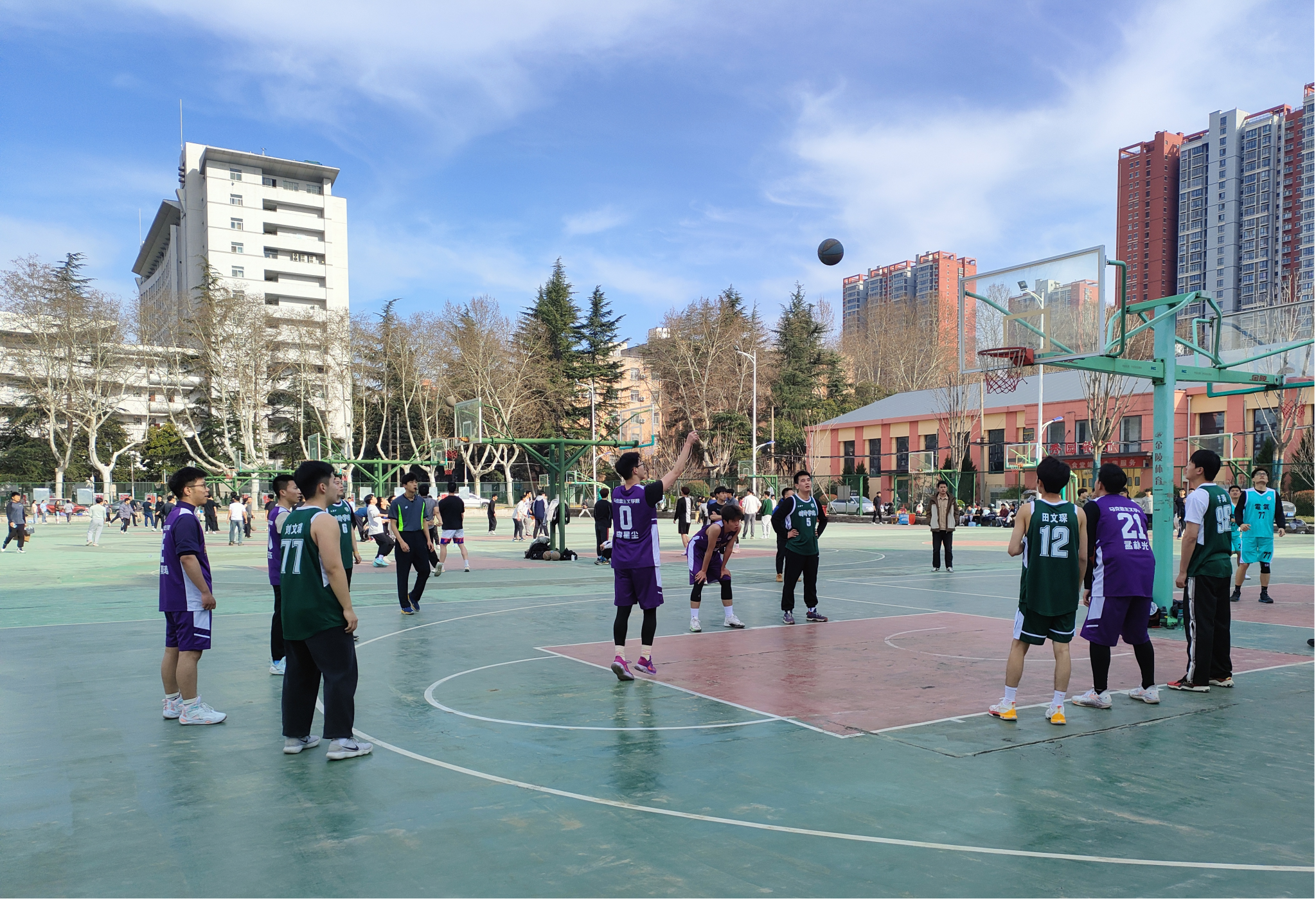 篮球赛场上,公司员工第一次参加校赛角逐,学院为队员统一购买队服,各位球员们也都精神饱满,全力以赴。带球,运球,投篮!他们潇洒的动作引起拉拉队员们的围观与喝彩!