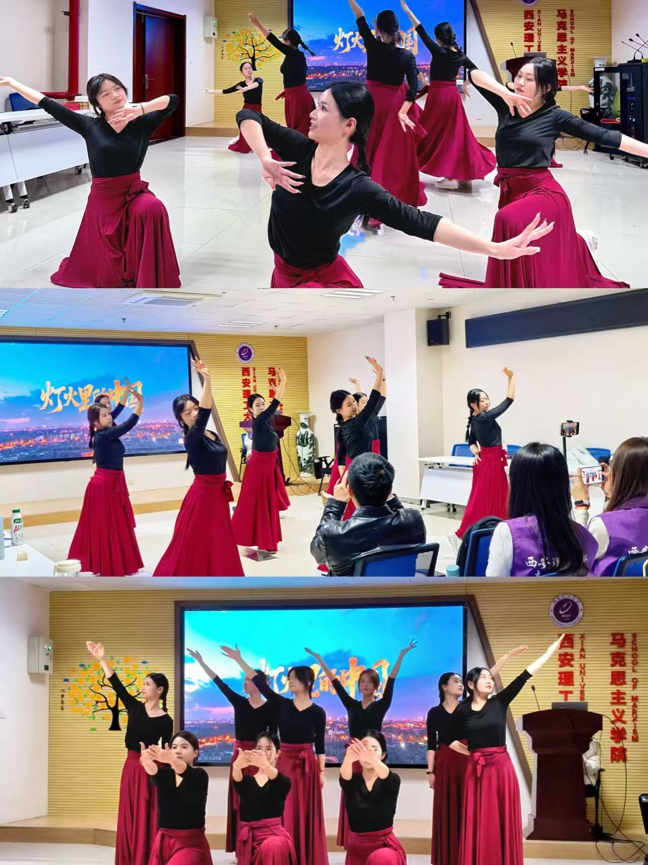 红色铸魂,深学精神谱系强信念。节目表演环节以丰富的艺术形式让红色精神可感可触、浸润心灵。微情景朗诵《照金精神耀青春信仰如炬向未来》率先拉开序幕,采用“时空对话”形式,通过革命战士与当代研究生的跨时空交流,结合深情朗诵,生动传递“坚定信念、艰苦奋斗、团结一心、勇闯新路”的照金精神。表演尾声,全体朗诵者齐声宣读红色宣言,进一步强化情感共鸣,让红色精神深深扎根。随后登场的舞蹈《灯火里的中国》,则以优美舞姿串联起从革命年代“星火微光”到新时代“万家灯火”的历史跨越,用肢体语言展现祖国的繁荣安宁,诉说着一代代中国人接续奋斗、红色基因代代相传的动人故事。