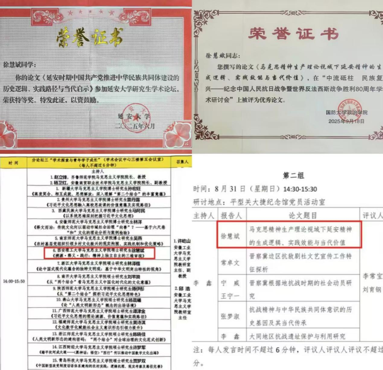 她积极参与高层次学术交流,曾参加由国防大学政治学院、延安大学、安徽工业大学、新疆农业大学等多所院校及研究机构主办的学术会议进行学习与交流。在“延安道路与当代中国”论坛中获特等奖,在抗战史相关研讨会中多次荣获优秀论文奖并作发言。这些经历使她得以追踪学术前沿,在对话与碰撞中深化思考,提升了研究视野与表达能力。