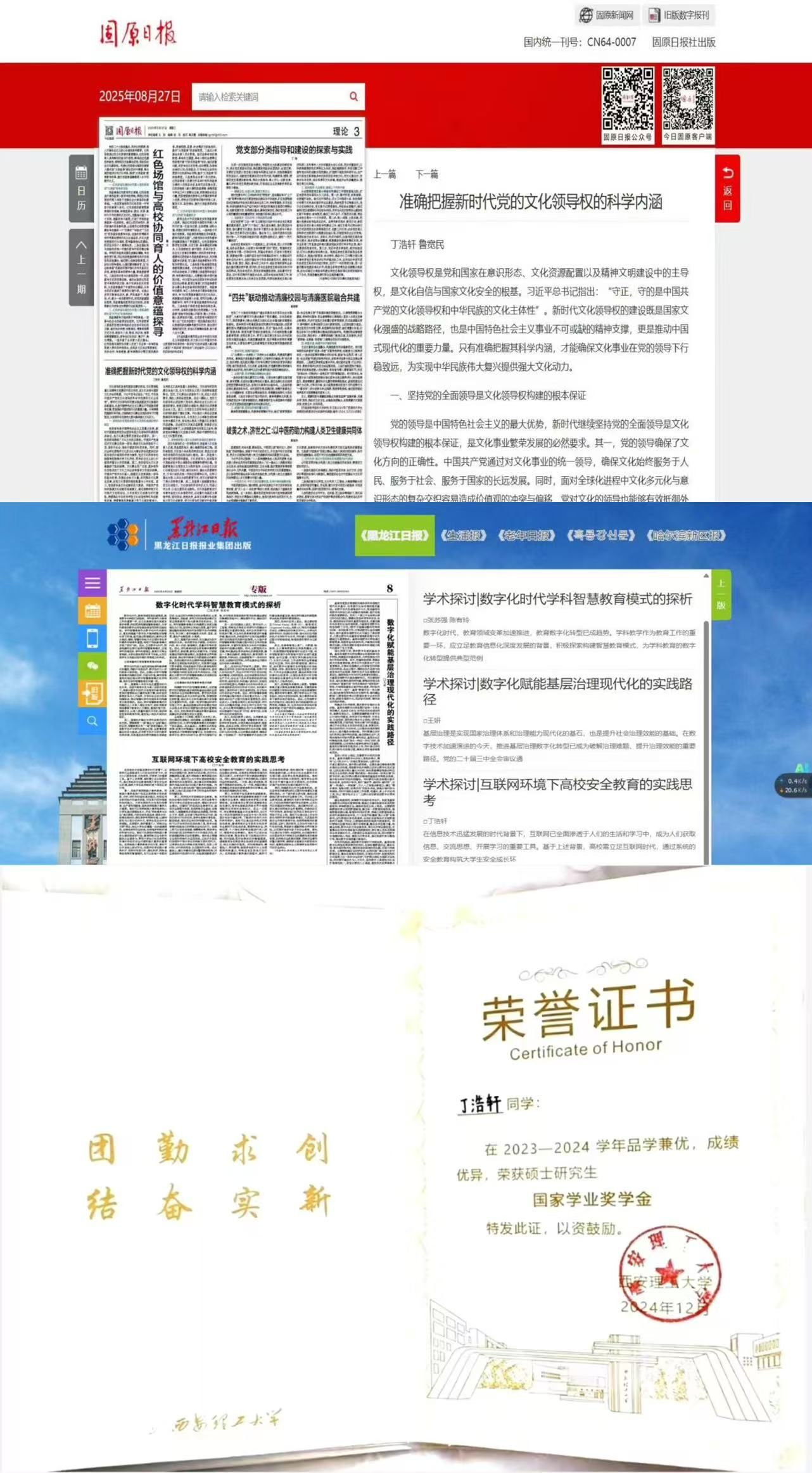 在学术科研的征程上,她始终秉持严谨求实的治学态度与开拓创新的探索精神,将课堂所学与理论研究紧密结合,关注时代课题,聚焦理论前沿,凭借扎实的理论功底和敏锐的问题意识,在省级报纸发表理论文章3篇,在地市级党报发表理论文章2篇。在专业学习上,刻苦勤奋,成绩始终名列前茅,曾获得研究生国家奖学金、国家学业奖学金、学校学业奖学金,夯实了专业根基。