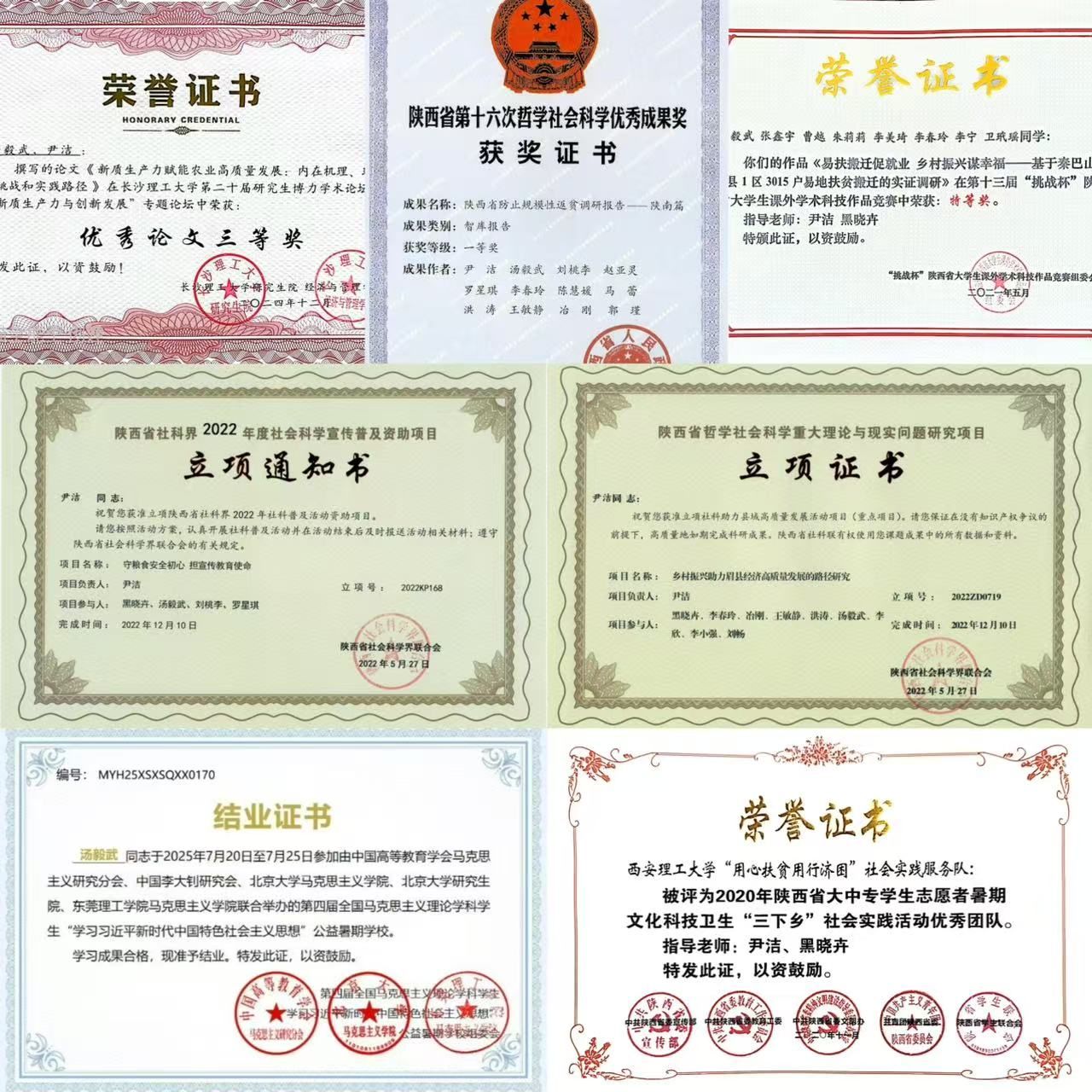 聚焦乡村振兴、共同富裕、贫困治理等前沿课题,汤毅武在学术领域持续深耕。他先后在《毛泽东邓小平理论研究》《教育理论与实践》《陕西社会科学》等刊物发表学术论文4篇,在省委内参《调研与决策》建言献策。主持陕西省社科联项目1项,核心参与国家社科基金、教育部项目等省级以上项目5项,系统掌握了从选题论证到报告撰写的完整研究流程。其研究成果备受认可,荣获陕西省第十六届哲学社会科学优秀成果一等奖、陕西省第八届和第九届研究生创新成果二等奖等多项荣誉。