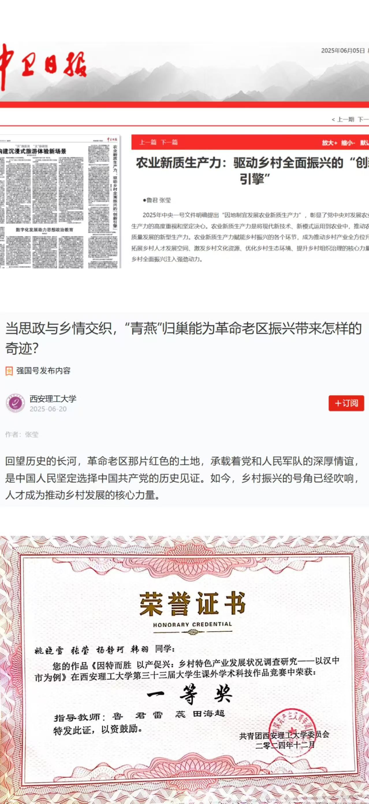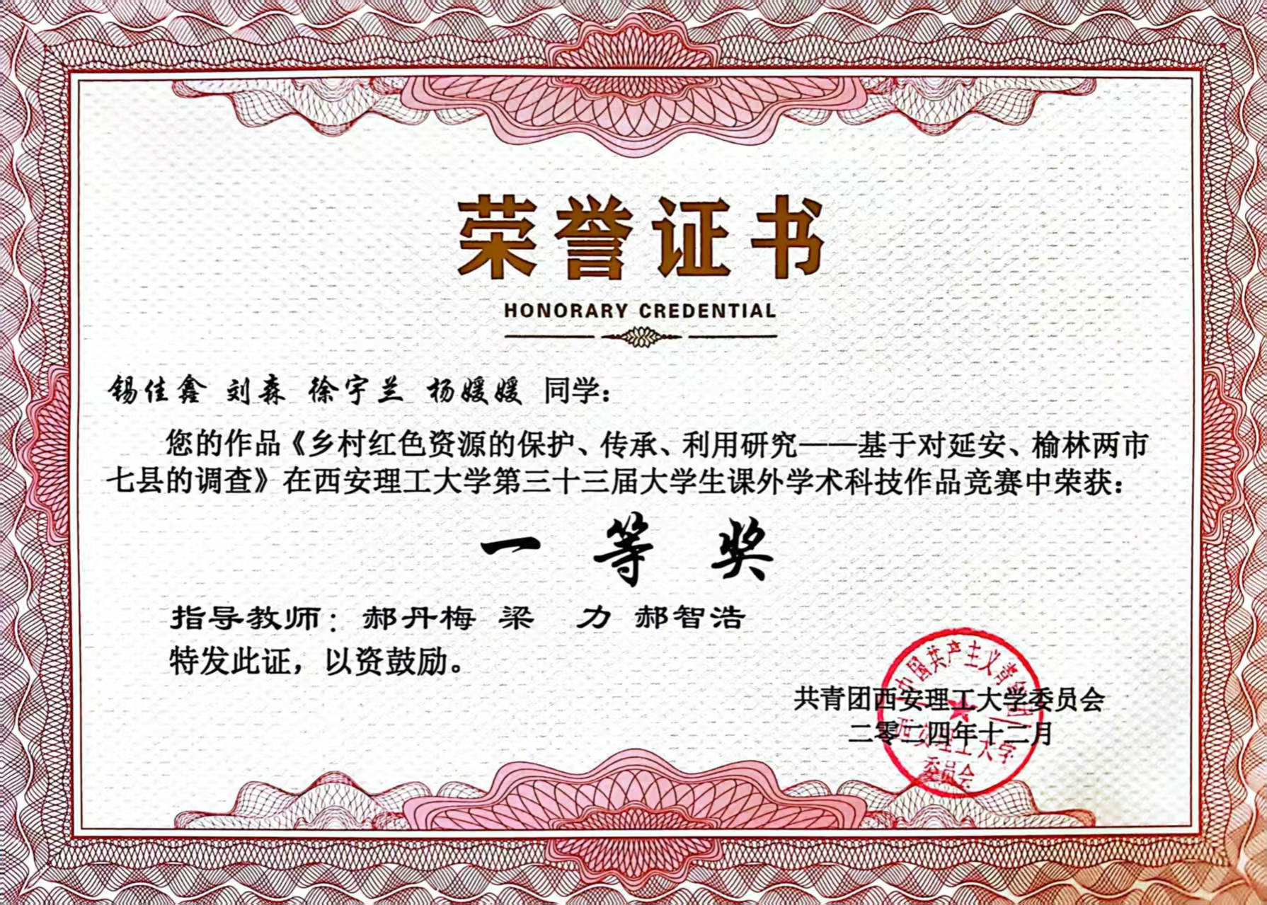 秉持知行合一的理念,徐宇兰积极投身社会实践与志愿服务。累计志愿服务时长达113小时,获评校级“优秀志愿者”。跟随调研团队深入延安、榆林2市7县的乡村红色革命基地,入户走访20余户,探访24处红色革命遗迹,发放线上线下调查问卷1000余份,团队调研成果获OK138太阳集团第33届学术科技作品竞赛一等奖,为推动党史学习教育与爱国主义教育发展注入青春力量。