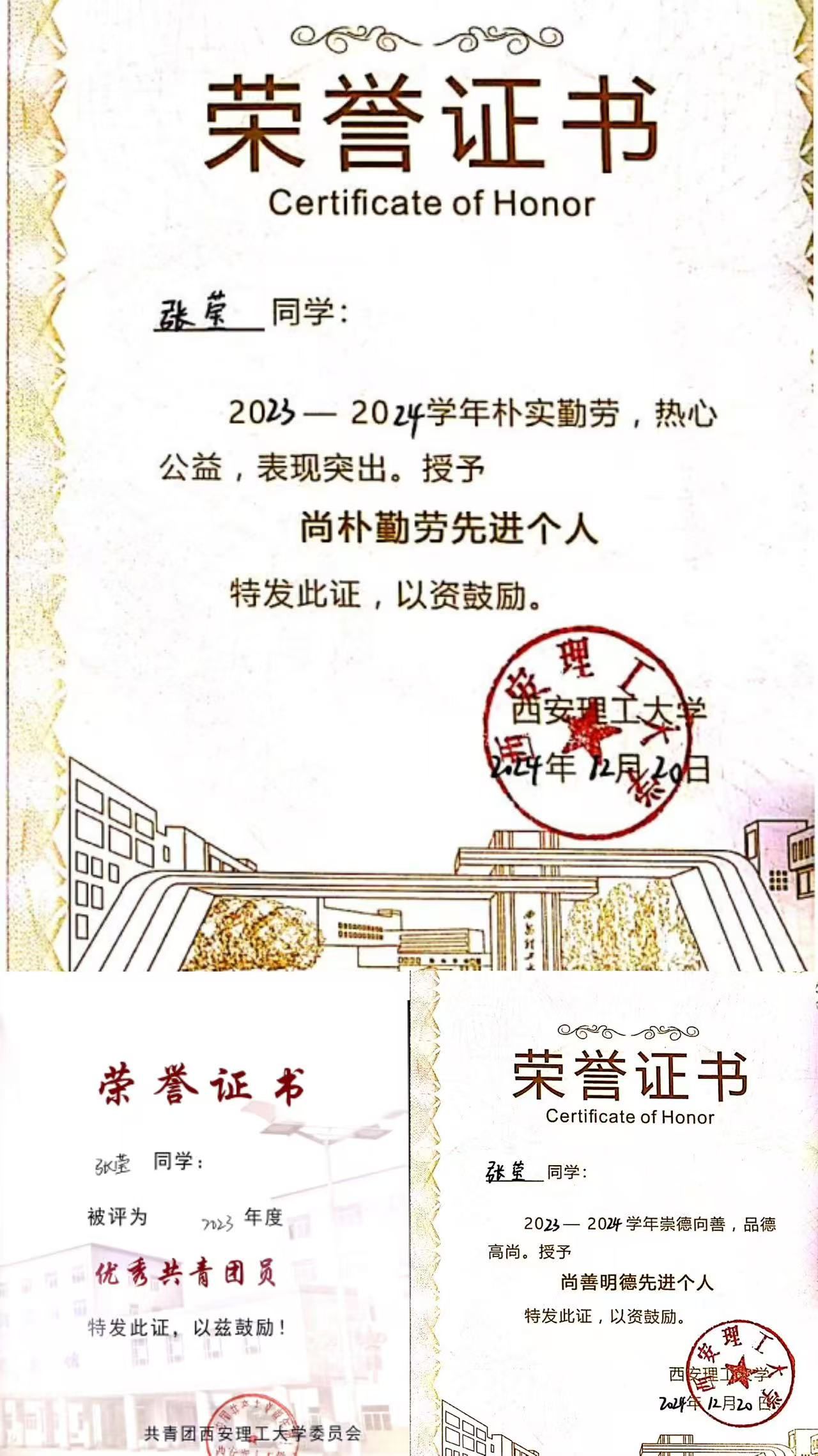 时刻以党员标准严格要求自己,张莹将个人成长与国家发展紧密结合。积极参与暑期社会实践,获优秀社会实践项目三等奖2项;先后获评校级“优秀共青团员”“优秀志愿者”“尚善崇德先进个人”等10余项荣誉称号。无论是员工工作中的认真负责,还是志愿服务中的主动担当,她都以饱满的热情、务实的作风感染着身边每一个人,用实际行动诠释着新时代青年的责任与担当。