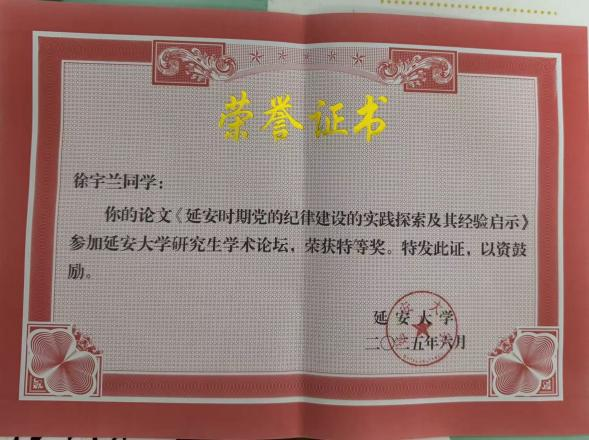 积极参与各类学术交流与学科竞赛,徐宇兰在思想碰撞中深化认知、提升本领。她先后斩获陕西省中共党史学会学术年会征文一等奖、陕西省社科界第19届长安学术年会一等奖、延安大学研究生学术论坛特等奖等15项荣誉,以赛促学、以赛促练,不断拓宽学术视野,锤炼专业技能。