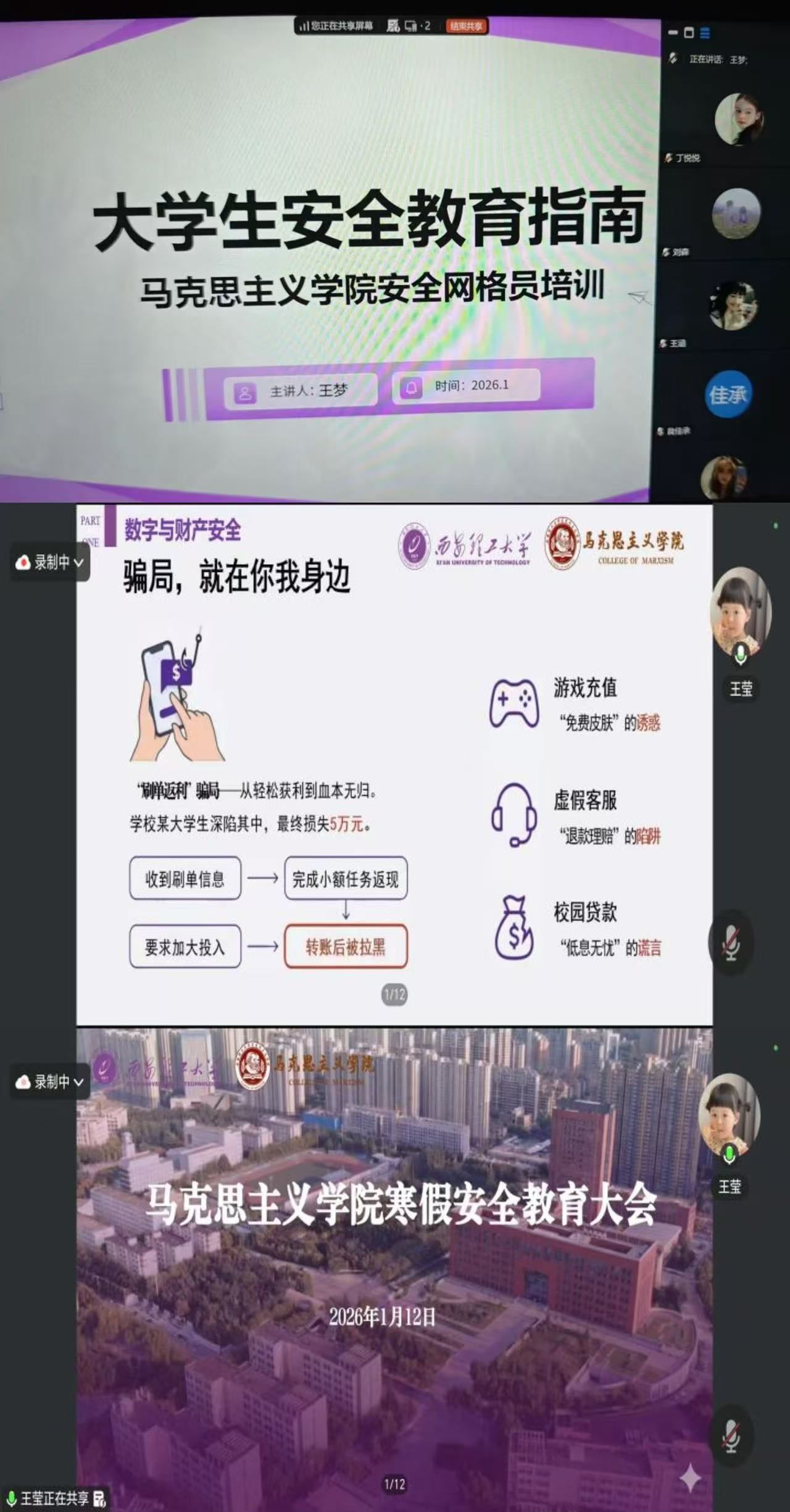 会上,辅导员们围绕“防范电信诈骗”“交通出行安全”“居家消防安全”及“假期心理调适”等关键方面展开系统讲解,剖析近期发生在高校的真实案例,重点提醒同学们在假期兼职、返乡旅途等场景中保持警惕,防范“备用金退款”“兼职刷单”等常见诈骗手段。同时,会议就离校前宿舍断电检查、假期居家用火用电等安全注意事项进行了强调,引导员工树立“安全第一、预防为主”的意识。在随后进行的安全网格员培训环节,辅导员带领网格员集中学习了《OK138太阳集团安全网格员队伍建设管理办法》,进一步明确了各层级网格员的职责与工作要求。会议强调,全体安全网格员在寒假期间要切实发挥“前哨”作用,认真履行信息上报与沟通联络职能,保持信息渠道畅通,及时关注和了解班级同学动态,确保各类异常情况和风险隐患能够“早发现、早报告、早处置”,共同筑牢学院假期安全防线。